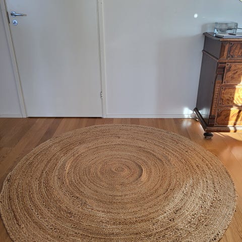 Kauniin luonnollisen värinen 100% juuttimatto. Tämän halkaisija on 120cm, lisäksi löytyy 3kpl noin 165cm (kaikki myynnissä omina kohteinaan). Jokainen matto on oma yksilönsä. Matot ovat sopivan ohuet (ovet mahtuvat aukeamaan). Siistissä kunnossa ovat, tahroja en löytänyt. Toimitustapana nouto tai Lahden alueella kuljetus kotiin +10e.