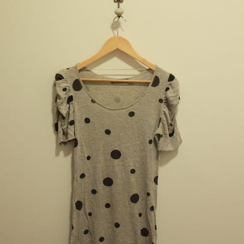 Klassinen vaaleanharmaa neulemekko. Mitat: kainalo 45 cm, pituus niska-helma 97 cm.