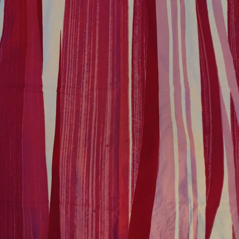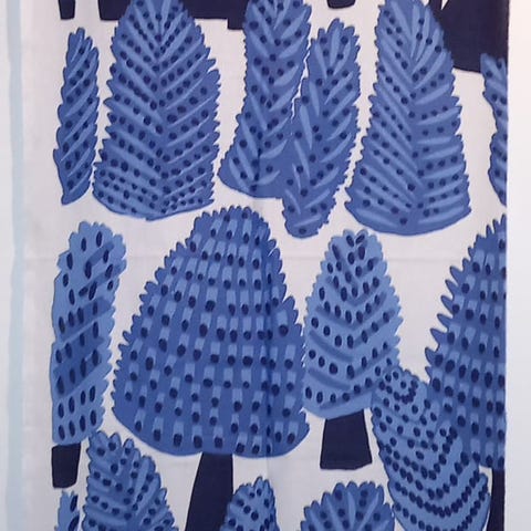 Marimekon Metsänväki kankaasta verhot, täysleveästä halkaistut. Toinen reuna ommeltu samoin päädyt.