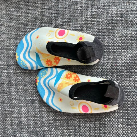 Swimpyn lasten uimakengät, koko 24/25, sisämitta kenkämitalla n. 15 cm. Punainen Babblarna-kuosi. Uudet, me käytettiin näistä pienempää kokoa muutaman kerran ja todettiin uimahallikäyttöön liian liukkaiksi, ja nämä jäivät meillä kokonaan käyttämättä. Sopivat siis paremmin rantakengiksi, kuten ohjeissakin sanotaan.