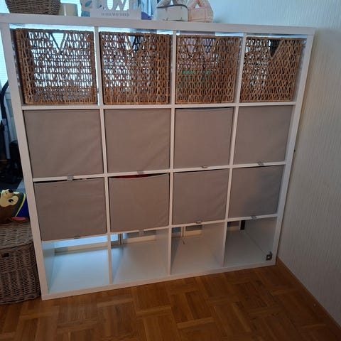 Ikean Kallax, 4x4 lokeron hylly. Ollut pari vuotta käytössä kirjahyllynä. Pientä kulumaa, katso kuvat. Voin ottaa kokonaisuudesta parempia kuvia myöhemmin jos saan sohvan pois edestä ensin :D