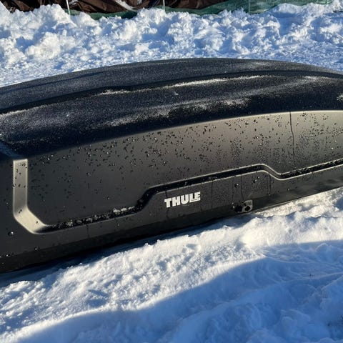 Suksiboksi / kattoboksi henkilöauton katolle. Pituus mitan perusteella noin 220 cm x90cm. Väri ulkopuolelta kiiltävä musta, sisäpuoli vaalea. Boksissa on sisäpuolella kiinnitysremmit kuorman sitomista varten sekä lukittava kahva joka toimii lisänä kaksi pika salpaa. Soveltuu suksien, lumilautojen tai muun matkatavaran kuljettamiseen auton katolla kattotelineiden kanssa.