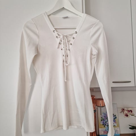 Materiaali on kevyt ja ohut polyesteri, joka tuntuu miellyttävältä ihoa vasten. Koko on S, mutta sopii myös L kokoiselle. Kunto on erinomainen, ei tahroja tai reikiä, käytetty kerran.