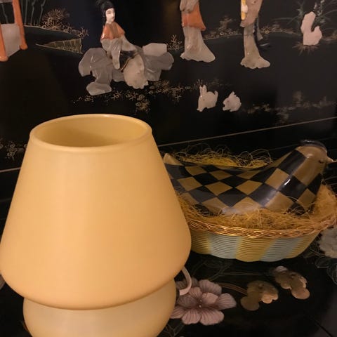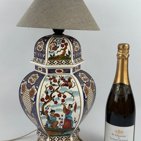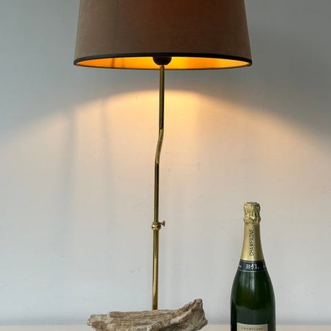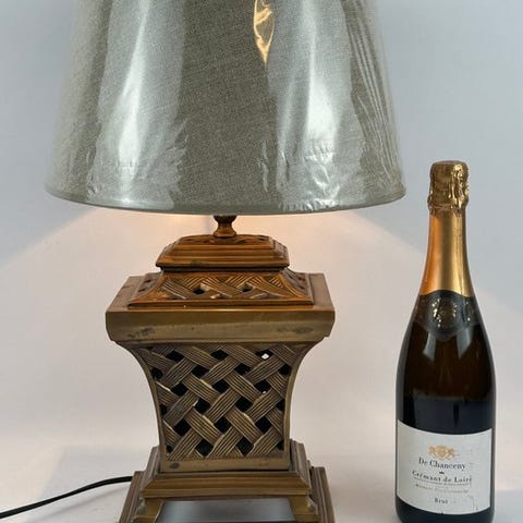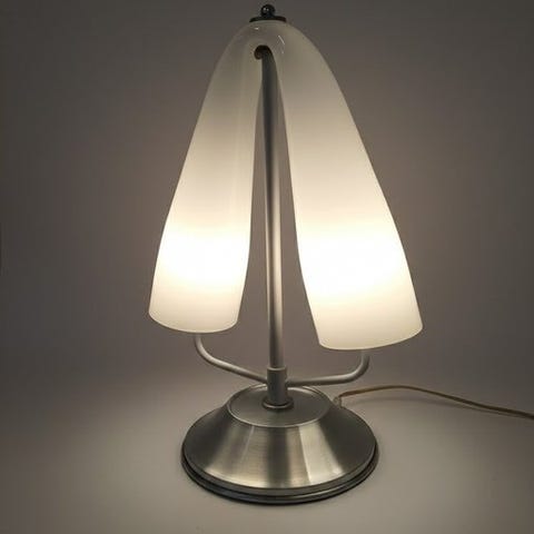 Tämä kaunis pöytälamppu, joka on valmistettu huurretusta lasista ja messinkikiinnikkeillä, on loistava esimerkki italialaisesta ajattomasta designista. Lasin väritys on todellisesti upea ja se luo loistavan tunnelmavalaistuksen. Koemme, että lamppu on yleisesti ottaen erittäin hyvä alkuperäinen kunnossa ilman halkeamia, hiushalkeita tai korjauksia.Mitat: korkeus 42 cm, pohjan Ø 14 cmLamppuvärjostimen mitat: korkeus 19 cm, halkaisija 30 cmEsine lähetetään rekisteröidyllä lähetyksellä.