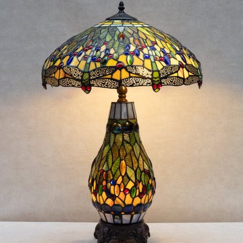 Tiffany-tyylinen pöytälamppu on kompaktin kuperalla varjostimella, joka on creme- ja lämpimän ambra-värisestä värillisestä lasista; reunus on kauniisti sudenkorennonmuotoisella reunuksella. Erittäin punaiset ovaalit cabochon-kivet antavat voimakkaan väriefektin, kun taas jalka on tumman antiikkisen pronssin värinen ja koristeellinen päättömappi antaa kokonaisuudelle autenttisen Art Nouveau -ilmeen. Kun lamppu on päällä, se levittää lämpimän, tunnelmallisen loisteen.Varustettu värillisestä lasista valmistetulla varjostimella ja metallijalustalla. Korkeus 35,5 cm, halkaisija 21 cm. Kaunis lamppu, jonka ajaton Tiffany- charm antaa lisänsä sivupöydälle, lipastolle tai lukupaikalle. Huolellisesti pakattu ja täysin vakuutettu toimitus.