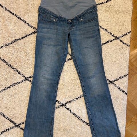 Kahdet itsellä loppuraskaudessa käytössä olleet mukavat farkut. Toiset väljemmät ja toiset tiukemmat, vastaavat noin 40-kokoa. Löysemmissä on hyvin tilaa suurellekin vatsalle.