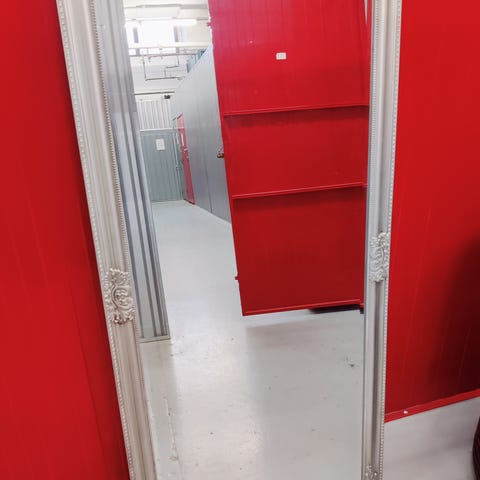 IKEA RISKA peili valkoisilla kehyksillä. Suorakaiteen muotoinen kokovartalopeili, jonka taustassa on ripustusvaijeri seinäkiinnitystä varten. Sopii esimerkiksi eteiseen, makuuhuoneeseen tai vaatehuoneeseen. Kehysmateriaalina maalattu puu- tai puukuitulevytyyppinen rakenne (tarkempi materiaali ei tiedossa). Pieniä käytön jälkiä kehyksen reunassa. Peili itsessään virheetön.