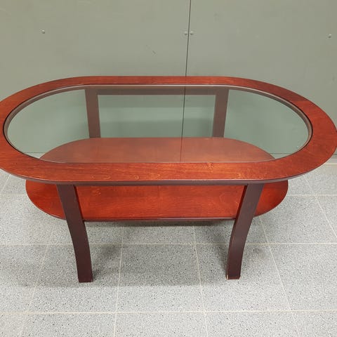 Siisti pieni 2 tasoinen sohvapöytä lasikansilla. Alemman tason korkeus: 26cm.