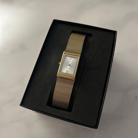 Leijona naisten rannekello kultaisella metallirannekkeella. Kellossa on suorakulmainen kellotaulu ja linkkiranneke, jossa on koristeelliset aukot. Ranneke ja kuori ovat metallia, väriltään kullan sävyiset. Kellotaulun väri on vaalea, ja siinä on selkeät viisarit ajan seurantaan. OVH= 125€ , ei paristoa.