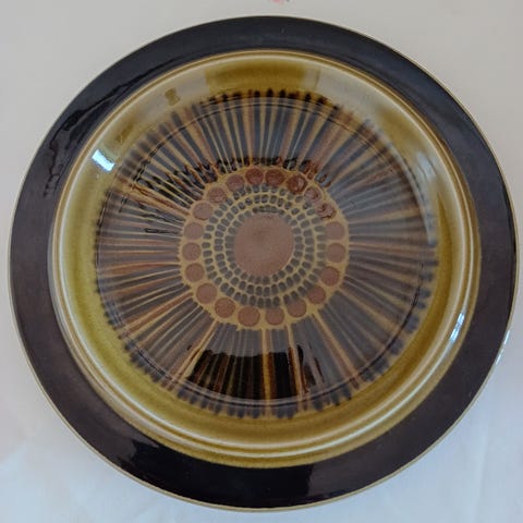 Arabia Kosmos lautanen. siinä on koristeellinen, säteittäinen kuviointi. Pohjassa on Kosmos-sarjan ja Arabian leimat, merkintä Made in Finland. Soveltuu esimerkiksi kattaukseen ruokalautasena tai tarjoiluun.
