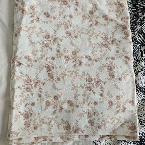 Kaunis musta kangas pinkin/purppuran ja oranssin värisellä kukka kuviolla. Kevyt ja kauniisti laskeutuvaa kangasta. Noin 93 x 84 cm pala