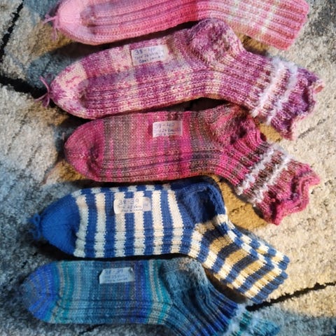 Käsintehdyt villasukat. Monivärinen lanka, jossa vaaleanpunaisen, oranssin, valkoisen ja harmaan sävyjä. Sukissa on resorivarsi ja vahvistettu kantapää. Sopivat arki- ja kotikäyttöön viileisiin päiviin. Koko ei käy ilmi kuvista, joten ostajan on hyvä varmistaa mitat myyjältä.