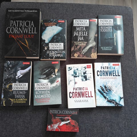 Patricia Cornwellin dekkarikirjoja suomen kielellä. Mm: Kuolleiden satama, Pahan jäljillä, Valokeilassa, Sytytyspiste, Mustalla merkitty, Kuolleiden kirja ja Punainen usva.