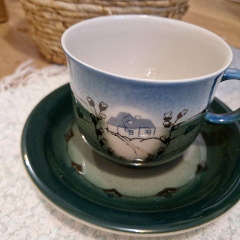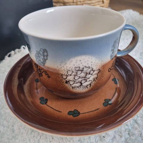 Arabian Heljä Liukko-Sundströmin suunnittelema v. 1981 Äidille kahvikuppi ja aluslautanen.