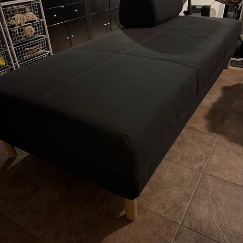 Tyylikäs beige kangasverhoiltu vuodesohva, kromijalat. Sohvassa on suorat käsinojat ja kaksi suurta selkätyynyä. Istuinosa voidaan vetää esiin, jolloin sohvasta muodostuu vuode. Paksu patjaosa tekee nukkumisesta erittäin mukavaa.