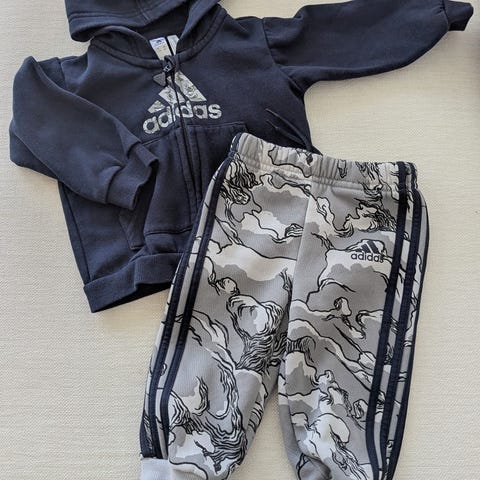 Siistikuntoinen Adidaksen setti, jossa paita ja housut. Kokomerkintä 68, mutta ottaisin käyttöön jo aiemmin. Paita on väriltään meleerattu sininen. Housuissa ja paidassa on pehmeäksi harjattu sisäpinta. Vaatteita on käytetty pari kertaa ja pesty hajusteettomalla pyykinpesuaineella. Meillä ei ole lemmikkejä. En postita alle 5 euron paketteja.