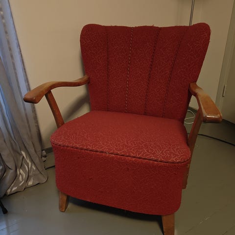 Myydään harmaa nojatuoli. Ehjä, mutta kankaassa on langanvetoja. Luulisin, että saksin siistittävä. Istuinominaisuudet hyvät, ehjä ja napakka. Kokonaiskorkeus 80 cm ja leveys n. 71 cm. Vastaava löytyy punaisena (kts. erillinen ilmoitus). Punaista siistimmässä kunnossa