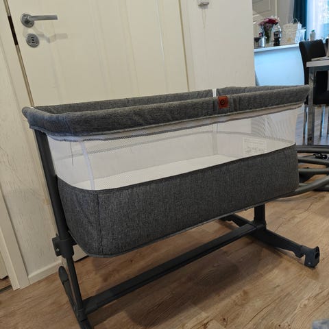 Erittäin hyvässä kunnossa. Ollut käytössä 5kk. Saa kiinnitettyä halutessaan sänkyyn. Laidan saa auki ja kiinni.