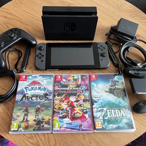 Nintendo Switch Zelda harvinainen versio. Pro ohjain mukaan ja kaksi peliä. Zelda säilytys kotelo ja panssarilasi asennettuna.