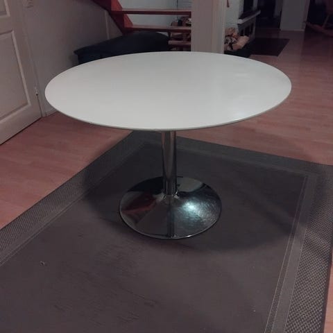 Jyskistä 1,5v sitten ostettu musta ruokapöytä, halkaisija 100cm. Istuttaa helposti neljä ruokailijaa, tiiviisti viisikin. Käytetty aina lautasenalustojen kanssa. Moitteettomassa kunnossa lukuunottamatta kannessa olevaa n. Sentin mittaista hankaumaa, joka syntynyt muuttaessa.
