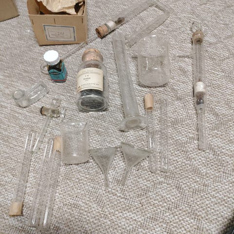 Chemistry kemiansetti. Pakkauksessa on erilaisia koeputkia, koeputkiteline, suppilo, harja sekä kemikaaliputkiloita ja ohjekirja suomenkielisillä käyttöohjeilla. Ei tietoa onko kaikki osat tallella. Koeputket lasia.