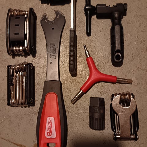Esimerkiksi pyörän korjaamiseen ja huoltoon sopivia työkaluja.