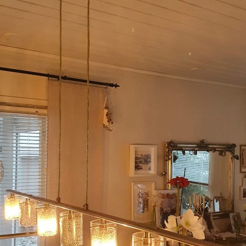Ellos Home Rafael kattovalaisin kolmella lampulla. Lamppujen pituutta saa säädettyä kierittämällä narua tangon ympäri.