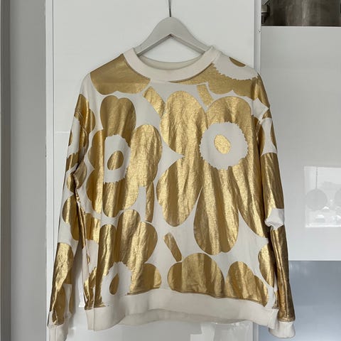 Marimekon Kerria unikko college, koko xl. Paita on uusi, mutta säilytyksessä kultauksiin on tullut taittoja/painaumia, unikoissa näkyy siis jälkiä. K-k: n. 68 cm, olka-helma n. 66 cm.