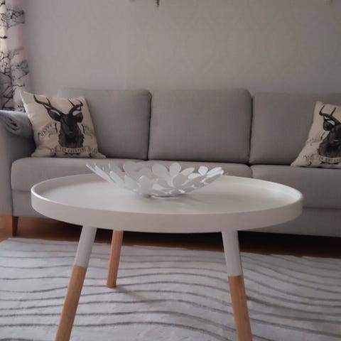Pyöreä halkaisijaltaan 75cm sohvapöytä. Puiset jalat. Kunto erittäin hyvä.