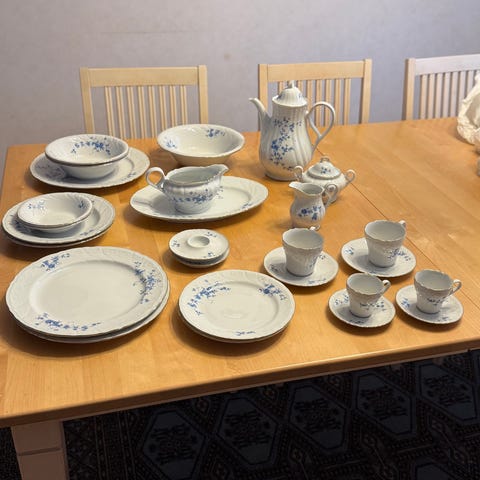 Hyväkuntoinen kahviastiasto: 12 mokkakuppia + aluslautaset, sokerikko, kermakko ja kahvikannu.