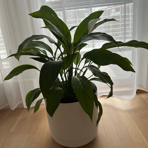 Vihreäkirjava huonekasvi ruukussa. Kasvilla on suuret, soikeat vihreät lehdet, joissa on vaaleita laikkuja. Sopii sisätiloihin valoisaan, mutta ei suoraan paahteeseen. Korkeus noin 100cm.