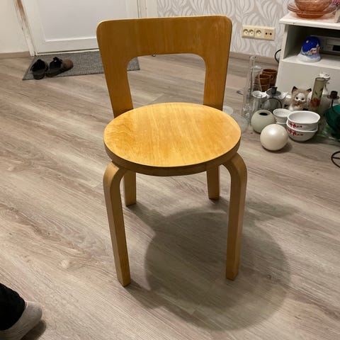 Kunnostettu; mustat osat maalattu ja alkuperäisruuvit kiristetty puhdistuksen jälkeen. Lakatut koivujalat. Mustat istuimet ja selkänoja.