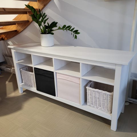 Jysk jernved senkki, jossa kaksi kaappia ja kolme laatikkoa. Kaapeissa välitaso. Rungon ja ovien väri on valkoinen, kansitaso on harmaa puunsävyinen. Vetimettömät ovet, jouset toimivat kaikissa. Laatikot aukeaa painamalla. Painaa, vain nouto.