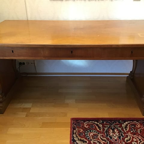 Kaunis kunnostettu vanhan ajan kirjoituspöytä myytävänä. Kunto hyvä ja runko ehjä. Kaksi vetolaatikkoa kannen alla. Kannessa muutamia hentoja jälkiä. Ei hajuja.