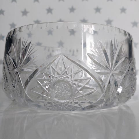 Aikoinaan 90-luvulta Viipurista ostettu kristallien kulho kannella. Painoa on ja lasin paksuus 0.5cm. Ehjä.