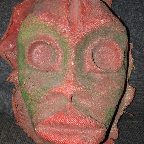 Tarjolla kaksi poikkeuksellisen hienoa, käsityönä muotoiltua nahka-aiheista seinämaskia. Naamiot on hankittu Istanbulista ja ne edustavat korkealaatuista turkkilaista nahan muotoiluosaamista (moulded leather art).