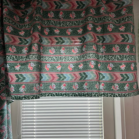Hyväkuntoinen Verhokappa hedelmä/marja kuvia, verhotankokuja, sivulta korkeus 81,5cm, matalin 52cm, leveys 235cm, alareuna aaltoileva/kaareva, mahd postikulut ostajalle