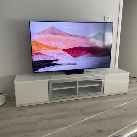 Valkoinen tv-taso. Yksi kaapin ovista kääntyy liikaa ’sisäänpäin’.
