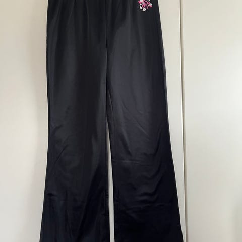 Ellos lasten housut tytöille, koko 140. Siniset, kevyestä 100 % puuvillasta valmistetut housut. Vyötäröllä leveä kuminauha ja kiristysnyöri, lahkeensuissa kuminauhat. Sivusaumoissa taskut. Sopivat arkeen ja vapaa-aikaan tytöille noin 140 cm pituudelle.