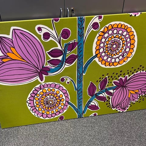 Jonkun itse tekemä suuri taulu Marimekon kankaasta. Ihana esim pienen pojan huoneeseen 🥰