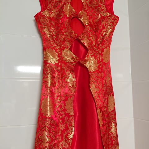 Upea, näyttävä kiinalainen silkkimekko, vastaa kokoa S. Punainen pohjaväri, turkoosinsiniset ja kultaiset kirjailut. Pitkä, helmassa molemmilla puolilla halkiot. Muutaman kerran pidetty eli erinomaisessa kunnossa, vain pienen pieniä huomaamattomia käytön jälkiä (esim yläosan nappien langat, jäävät siis piiloon päällä). Yläosassa napit ja kyljessä vetoketju.
