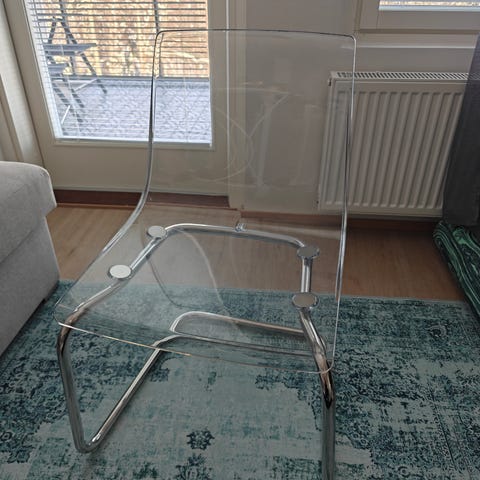 Hyväkuntoinen läpinäkyvä/kromattu ja vähän joustava tuoli.