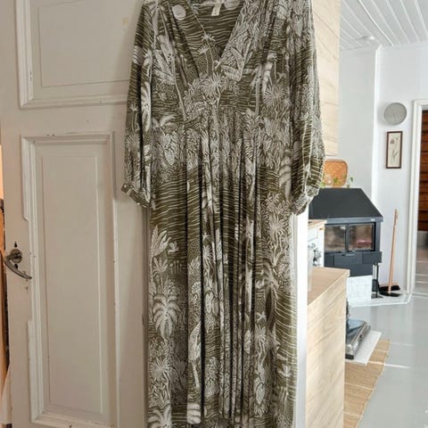 H&M erikoismalliston valkoinen pellava/puuvillatunika ruskealla palmukuvioinnilla. Koko S, mutta on todella väljä ja reilu. Menee helposti M kokoiselle.
