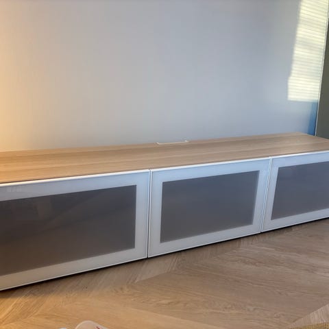Myydään ikean bestå tv-taso. Keskellä taso, josta saa johdot lävitse. Sivuilla yksittäiset kaapit. Mitat näkyy ikean kuvissa. Saa laitettua seinään, mutta meillä on ollut lattialla.