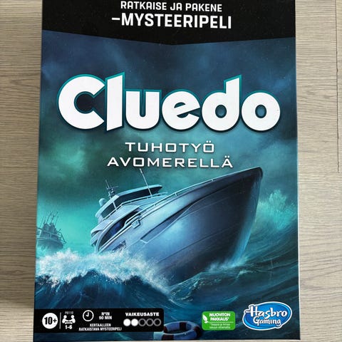 Myydään kuvien mukainen Cluedo tuhotyö avomerellä-mysteeripeli, pakohuonepeli-tyyppinen yhteistyöpeli. Peli on kertaalleen siististi pelattu, mutta alkuperäiseen kuntoon järjestelty. Pelissä ei leikata eikä piirrellä pelin osiin, joten se pysyy hyvänä useammastakin pelikerrasta huolimatta. Suositus ikä 10+