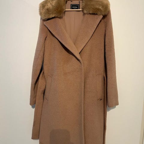 Guess villakangastakki naisille, koko S. Musta, jossa leveä kaulus ja kaksirivinen nappikiinnitys. Takissa on koristeelliset hopeansävyiset niitit tai napit etutaskujen kohdalla. Materiaalina villakangas, Sopii arki- ja siistimpään käyttöön viileämpiin säihin.