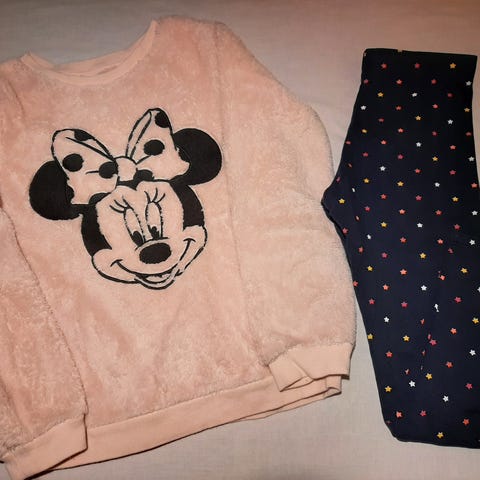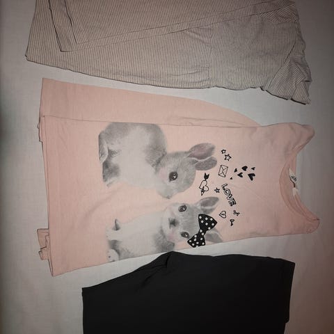 Benetton t-paita tytöille, kokoarvio 134/ 140, kokolappua ei ole. Niska-helma 42 cm, kainalosaumojen väli 34 cm. Väri vaaleanpunainen. Lyhythihainen malli, jossa edessä Benetton-teksti. Sopii arkipukeutumiseen ja vapaa-aikaan. Edessä 2 hyvin haaleaa tahraa. Raidalliset housut koko 140, H&M.