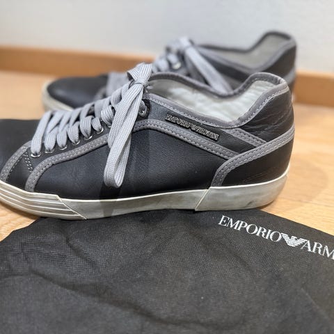 Emporio Armani tennarit, koko 40. Väriltään mustat nauhakengät, joissa sivuilla koristeena niitein muodostettu logokuvio. Pohjassa matala koroke ja kontrastiraita. Sopivat arkeen ja vapaa-aikaan.