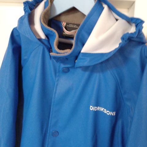Sininen Didriksons sadetakki, koko 130. Hyvässä käytetyssä kunnossa, siisti ja ehjä