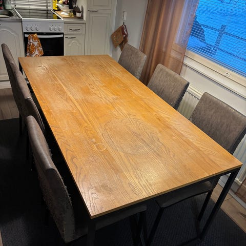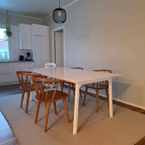 Pöydän leveys ilman jatkopalaa noin 105 cm. Jatkopalan leveys 35 cm.